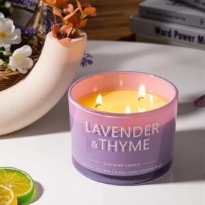- LAVENDER THYME CANDLE: A balanced blend of gentle lavender and fresh thyme, combining floral and herbal notes into a smooth, calming aroma. This refined scent adds softness and harmony, creating a peaceful and elegant ambiance throughout your home