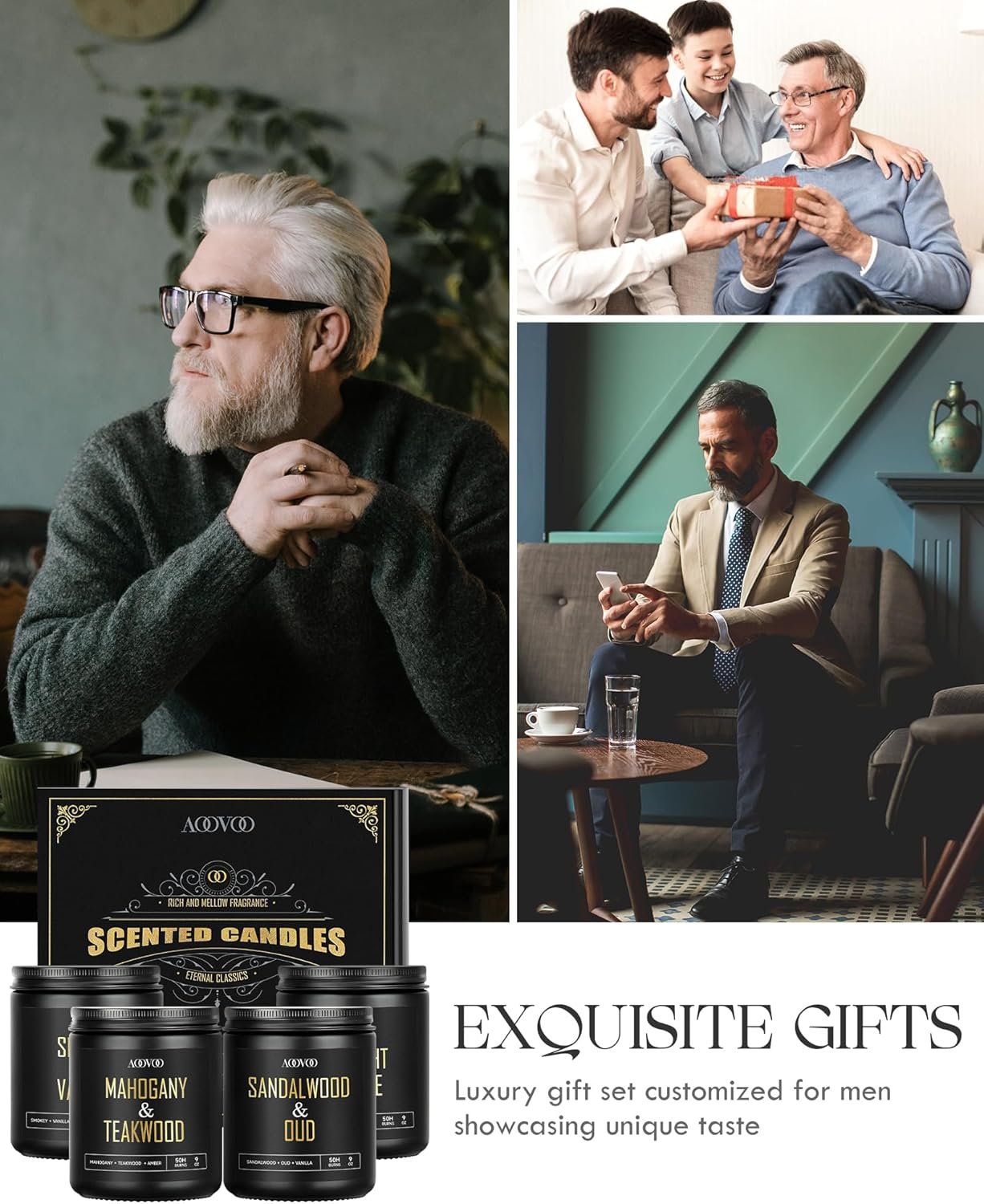 AOOVOO Scented Candles for Men – 4 Pack Candles for Home Scented, 36oz Soy Wax, 200 Hour Burn Time, Men Candle Set, Sandalwood Oud/Mahogany Teakwood/Smoke Vanilla/Jasmine Candle Set A